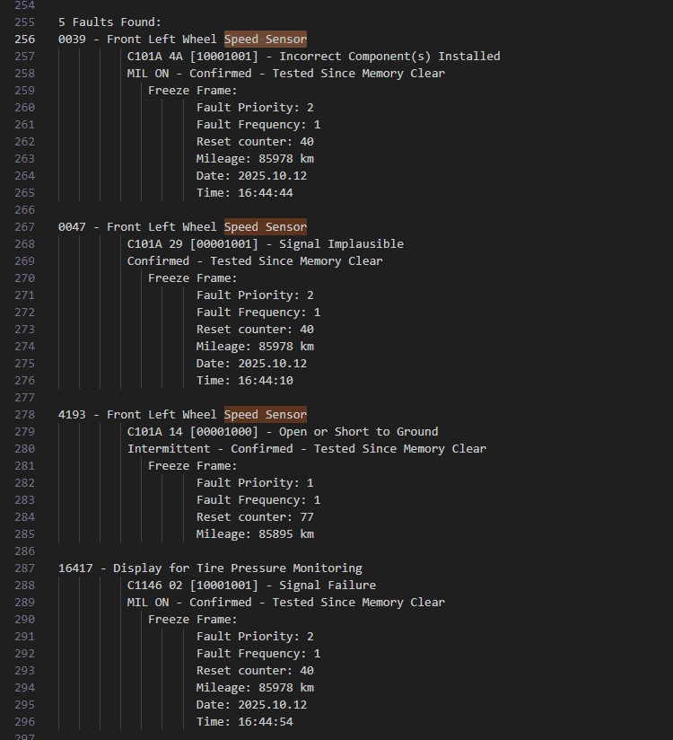 手元にあった VCDS を使って診断したところ、やっぱりというかどうやらというか、左フロントの ABSスピードセンサが怪しいみたいです。